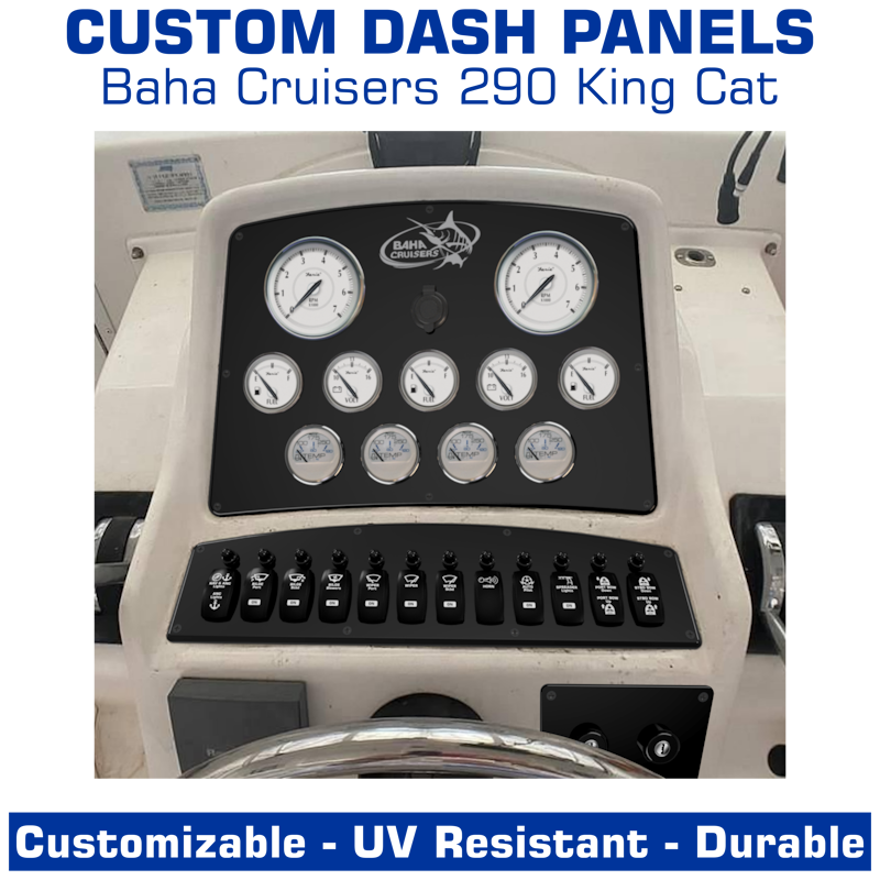 The Baha Cruisers 290 King Cat console consists of a 3-part dash panel, switch panel & key/ignition switch panel setup. There is a dash panel, a switch panel, & a key/ignition switch panel. This listing is for a blank dash panel, a blank switch panel, and a blank key/ignition switch panel, or pre-designed switch panel. You can purchase the dash panel, switch panel, & key/ignition switch panel independently or you can purchase the entire 3-part dash setup.