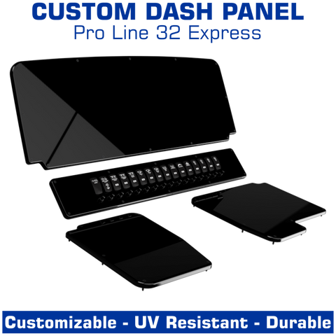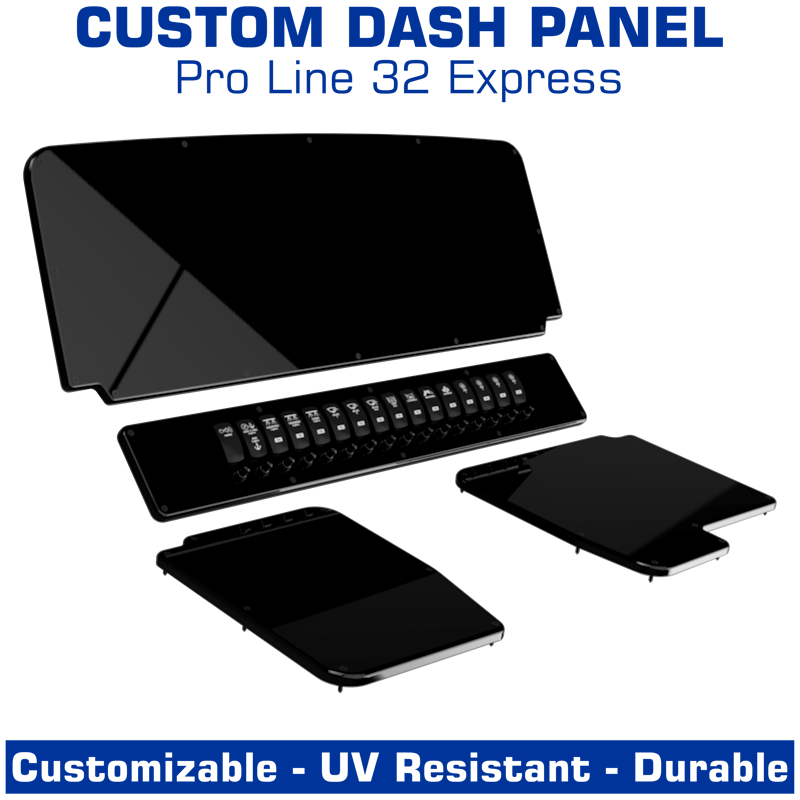 The Pro Line 32 Express console consist of 4-part dash panels setup. There is a top dash panel, a switch panel, a port side bottom dash panel and a starboard side bottom dash panel. This listing is for a blank top dash panel, a blank switch panel, a blank port side bottom dash panel and a blank starboard side bottom dash panel, or a pre-designed switch panel. You can purchase the custom panels independently or you can purchase the entire 4-part dash setup.