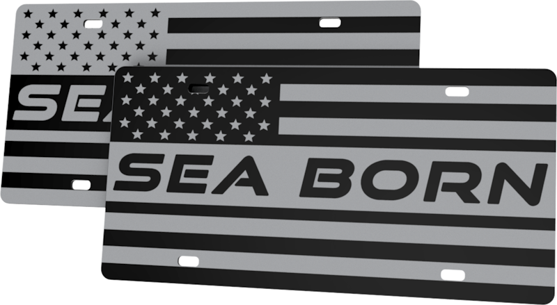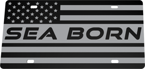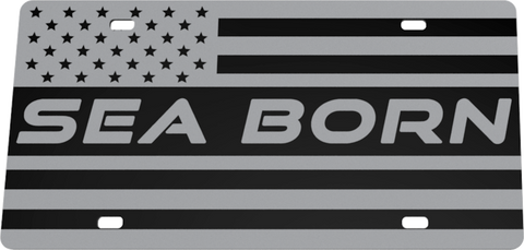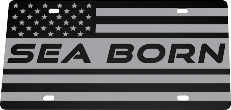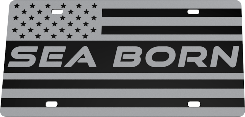 This extremely high gloss black acrylic license plate is 1/8" thick and boasts a beautiful American Flag image behind the iconic Sea Born logo.