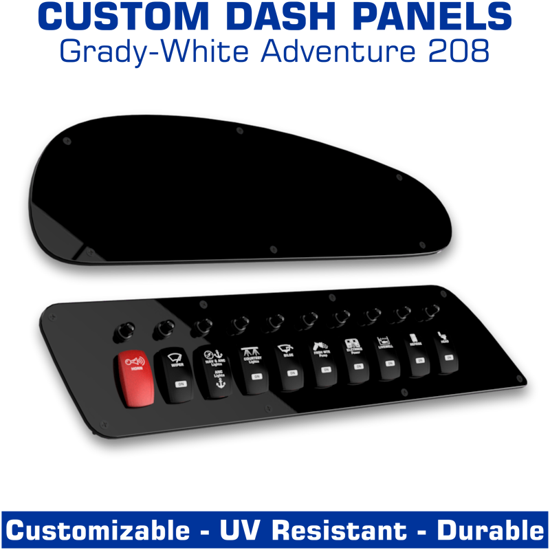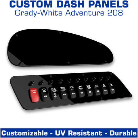The Grady-White Adventure 208 console consists of a 2-part dash setup. There is a gauge panel, and a switch panel. This listing is for a blank gauge panel, and a blank switch panel, or a pre-designed switch panel. You can purchase the custom panels independently or you can purchase the entire 2-part dash setup.