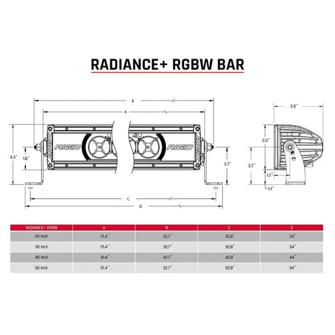 The stylish versatility of the RIGID Radiance light bars just got better. Now introducing Radiance+ RBGW light bars. The latest addition to the Radiance light family provides you with the ability to toggle between eight available backlight options with the flip of a switch: red, green, blue, light blue, purple, amber, white, or demo mode. The RIGID Radiance+ RGBW bars are built with the same high-grade aluminum alloy housing as RIGID's legendary E-Series but include a stylish color-changing backlight.