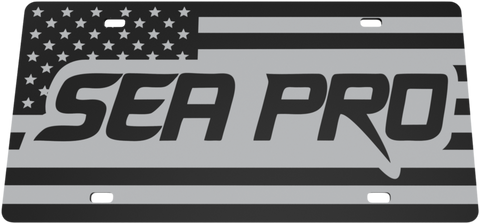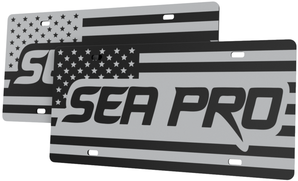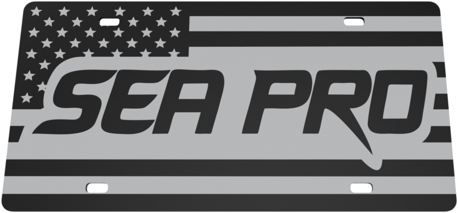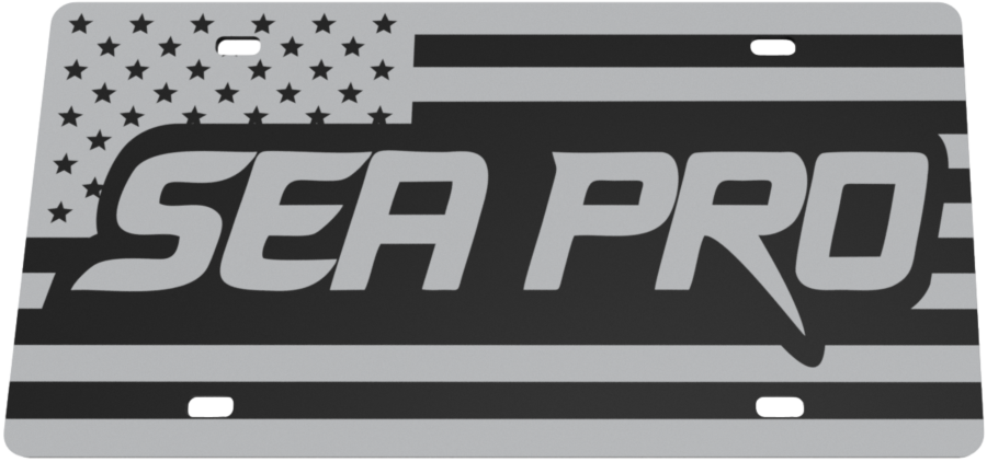 This extremely high gloss black acrylic license plate is 1/8" thick and boasts a beautiful American Flag image behind the iconic Sea Pro logo.