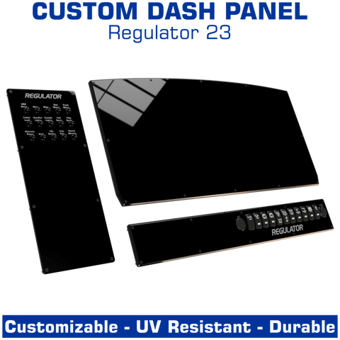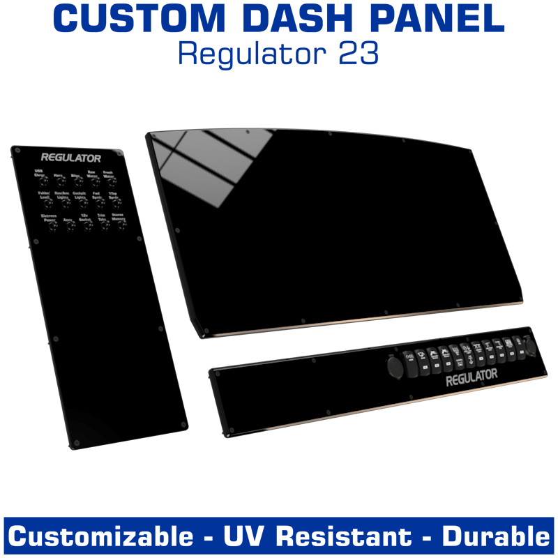 The Regulator 23 console consist of a 2-part dash setup with an interior breaker & battery panel. There is a top dash panel, bottom switch panel, and an interior breaker panel. This listing is for a blank dash panel, blank switch panel, and blank breaker panel or pre-designed panels.