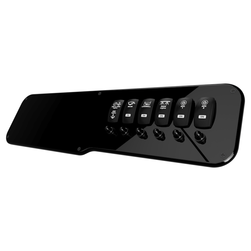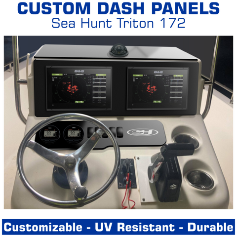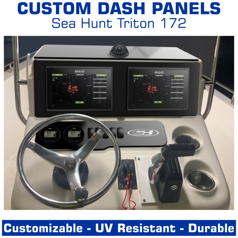 The Sea Hunt Triton 172 console consists of a 3-part dash & switch panel setup. There is a top horizontal panel, dash panel and switch panel. This listing is for a blank top horizontal panel, a blank dash panel and a blank switch panel, or a pre-designed switch panel. You can purchase the custom panels independently or you can purchase the entire 3-part dash setup.