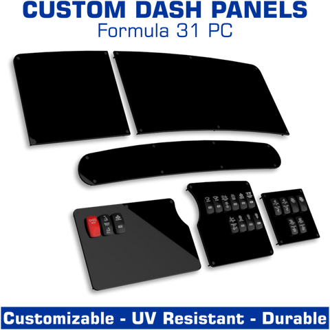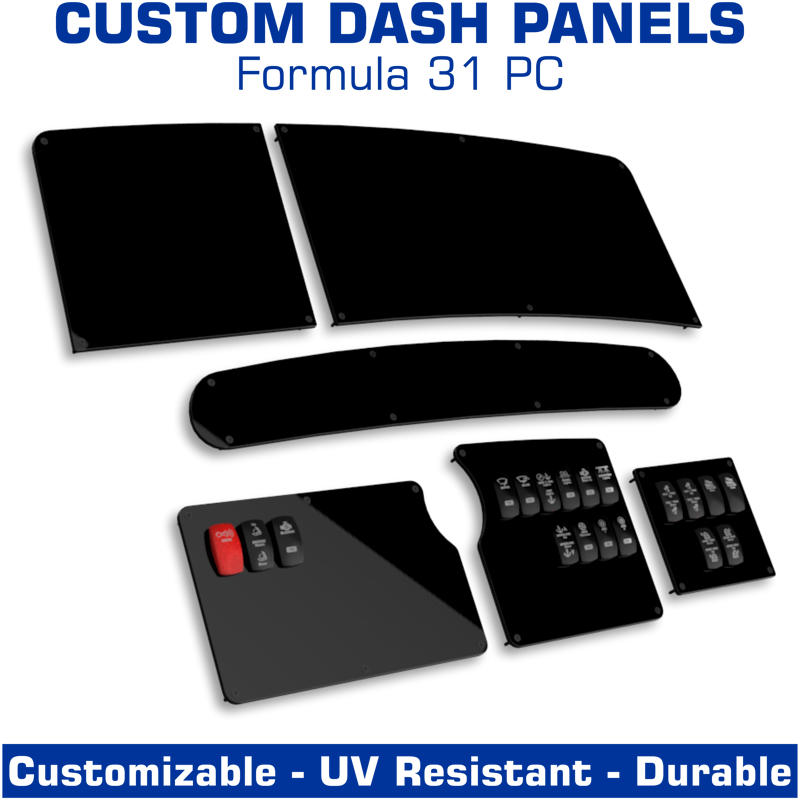 The Formula 31 PC console consists of a 6-part dash setup. There is a Port Side Dash Panel, Stbd Side Dash Panel, Gauge Panel, Port Side Switch Panel, Stbd Side Switch Panel, and a Trim Switch Panel. This listing is for a blank Port Side Dash Panel, a blank Stbd Side Dash Panel, a blank Gauge Panel, a blank Port Side Switch Panel, a blank Stbd Side Switch Panel, and a blank Trim Switch Panel or a pre-designed Port Side Switch Panel, a pre-designed Stbd Side Switch Panel, and a pre-designed Trim Switch Panel. You can purchase the custom panels independently or you can purchase the entire 6-part dash setup.