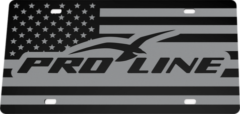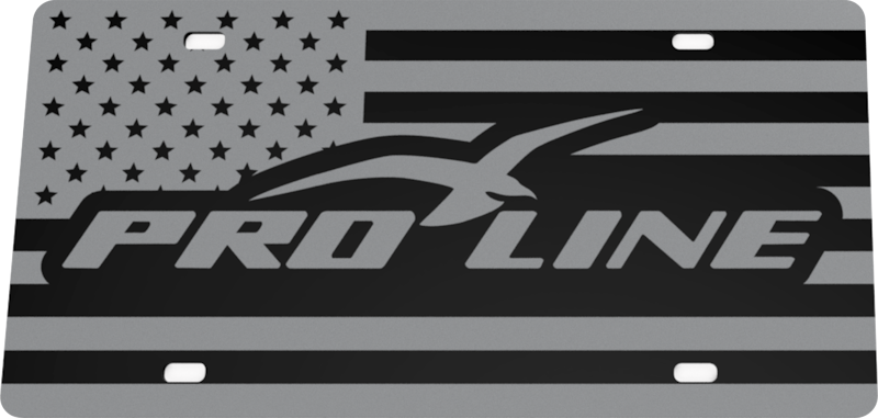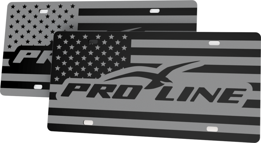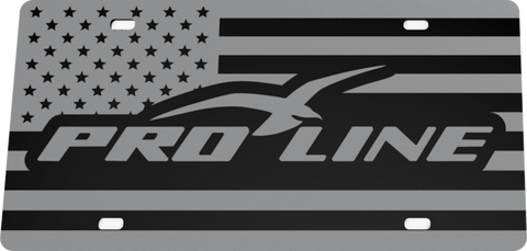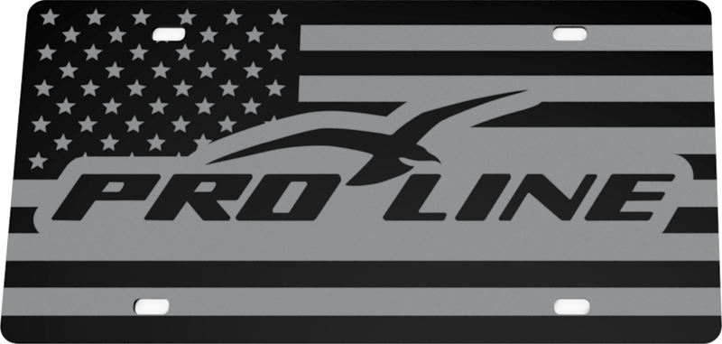 This extremely high gloss black acrylic license plate is 1/8" thick and boasts a beautiful American Flag image behind the iconic Pro Line logo.