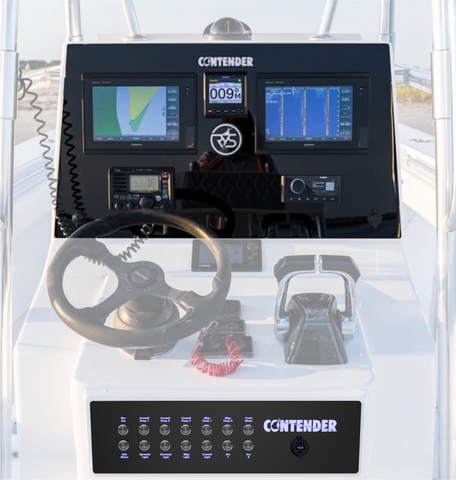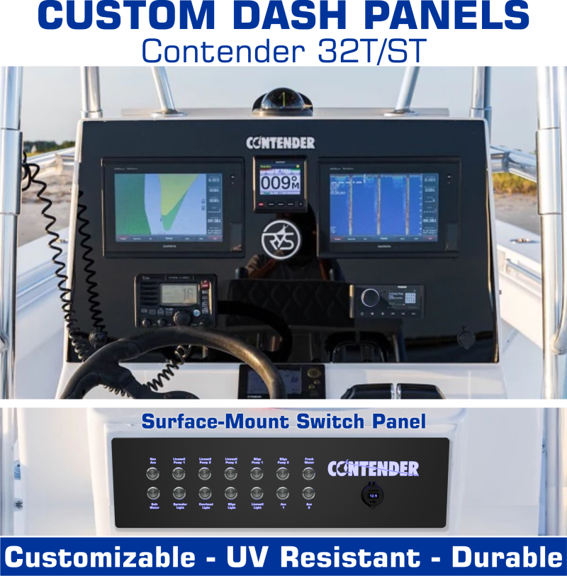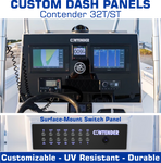 The Contender 32T/ST Open console consists of a 2-part dash setup. There is a dash panel, and a switch panel (surface mount) down around your knees. This listing is for a blank dash panel, and a blank switch panel, or a pre-designed switch panel. You can purchase the custom panels independently or you can purchase the entire 2-part dash setup.