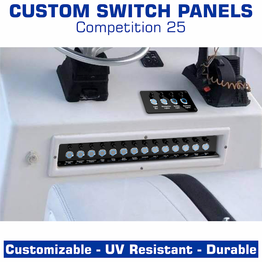 Upgrade options are listed below and can be added during the next step; the design!  We recommend you purchase both switch panels for the Competition 25 console and let our design team come up with something custom and incredible for your boat and your needs.